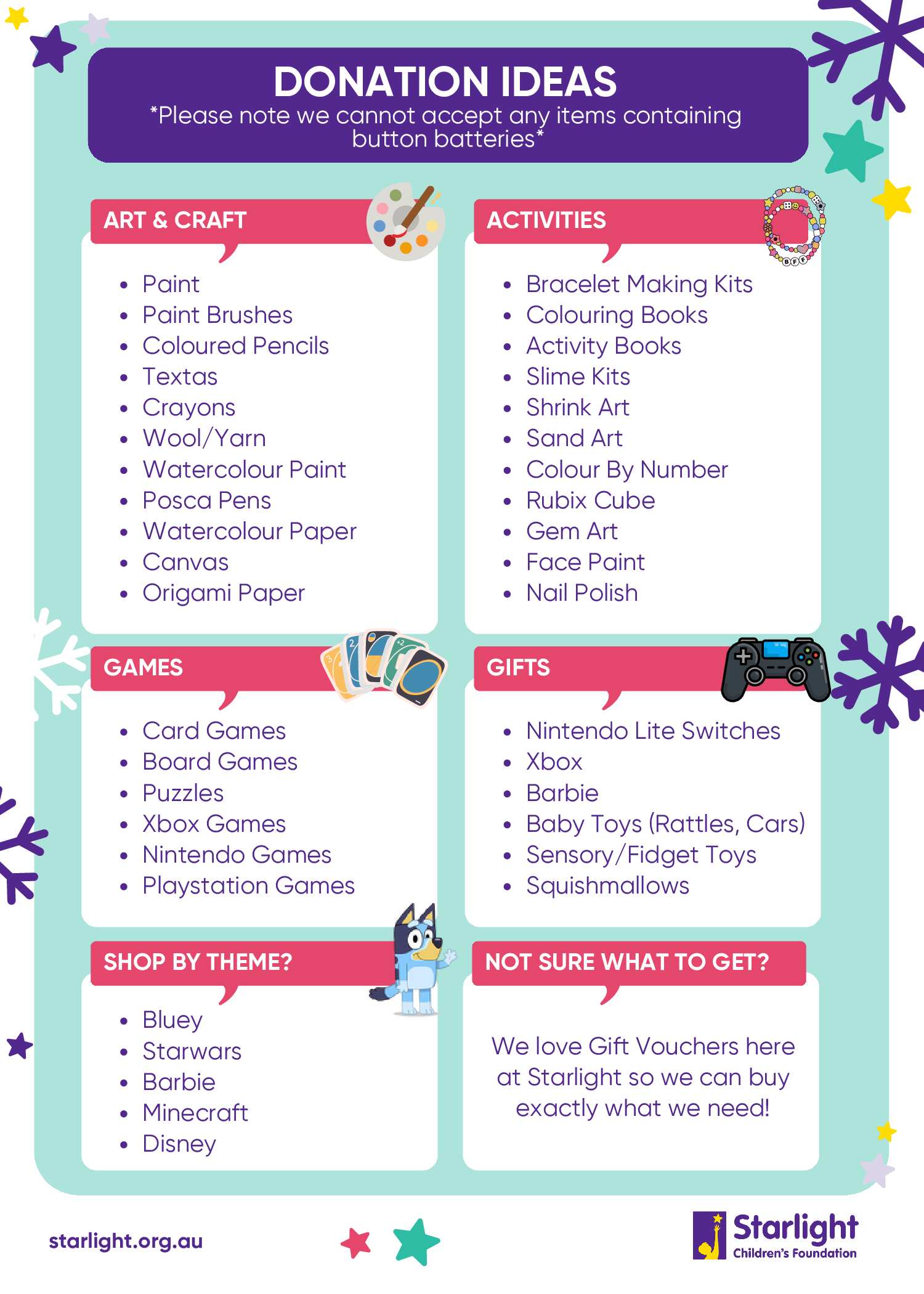 Need a little inspiration. See the suggestions below from Starlight Children’s Foundation